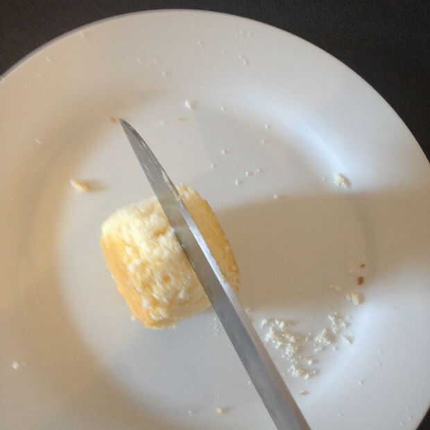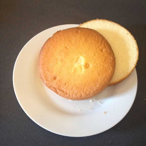 1. utilizando el cuchillo para picar, picar cada esponja por la mitad horizontalmente. Por favor cada esponja detrás en su propio plato. Esto es para evitar que se peguen entre sí y desmoronando.