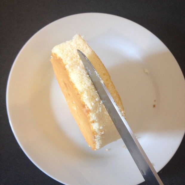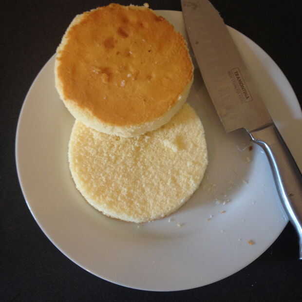 Mi consejo : Sostenga el borde de la torta en una mano y deslice el cuchillo mediado a través de (no). Luego rodar la torta de su y continuar surcando suavemente hasta que vuelvas a donde empezaste. Asegúrese de que guarda el cuchillo centrado a lo largo del lado de la esponja.