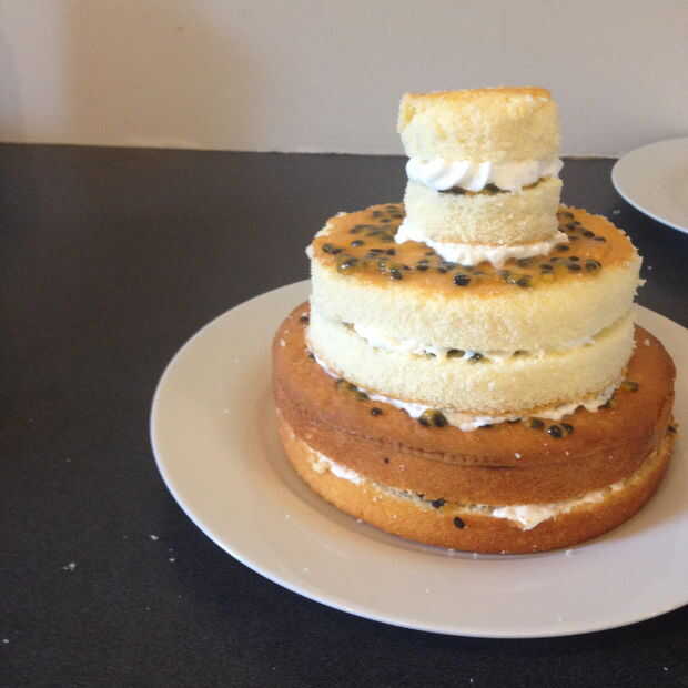 Mi Consejo: reforzar la estructura de la torta cortando un pincho a su tamaño y pegando por el centro. El extremo de la brocheta vendría sólo a través de la parte inferior de la pieza superior de la esponja pero no debe meter a la parte superior visible de la torta.