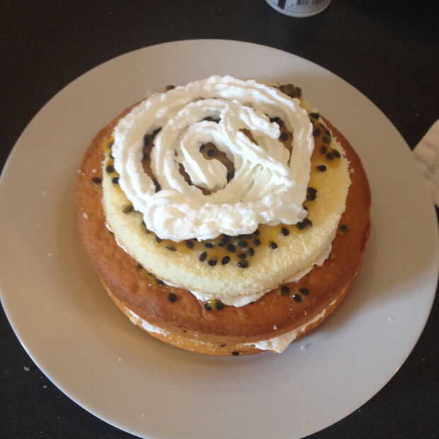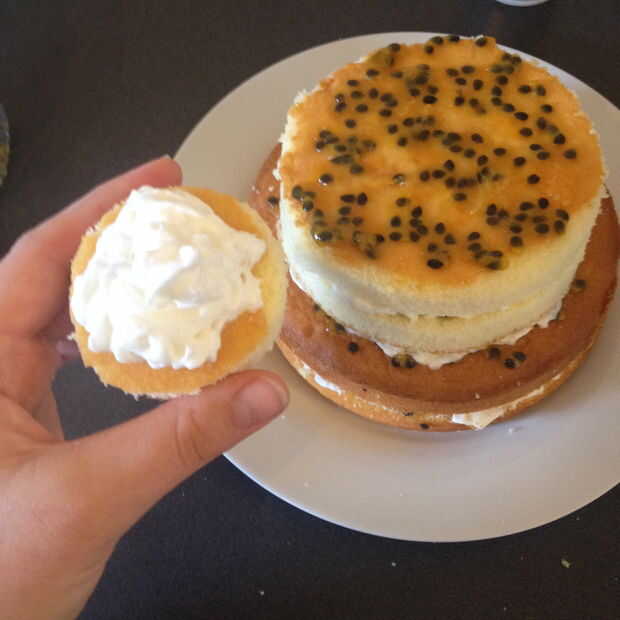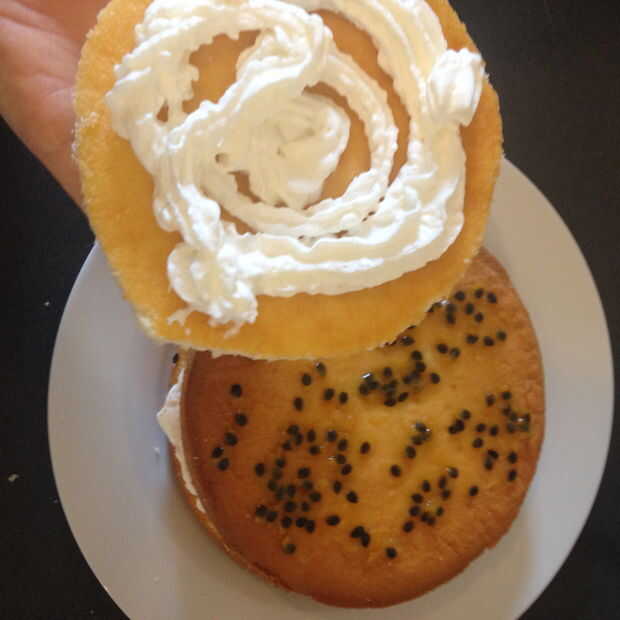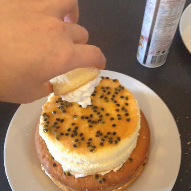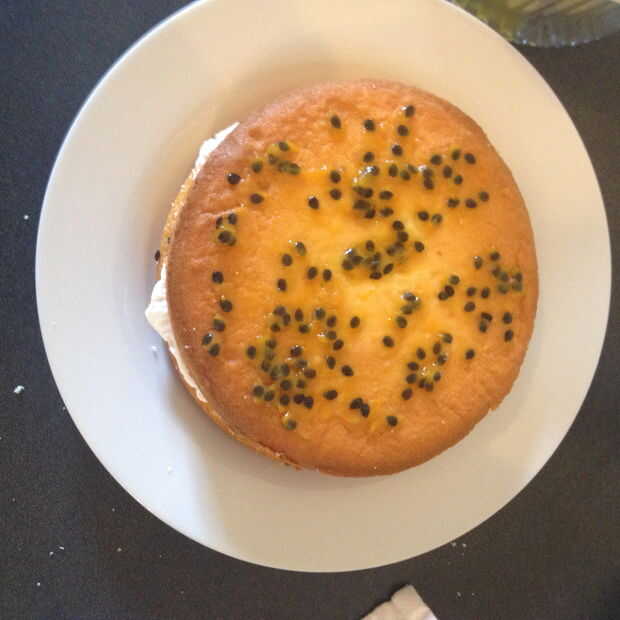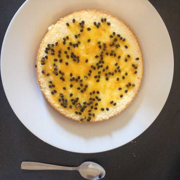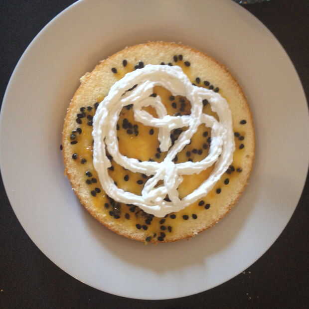 2. Cubierta de la fruta de la pasión con crema batida. Lugar extra alrededor del borde para que se derrama hacia fuera un poco y se ve delicioso.
