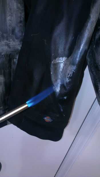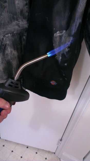 - Usando pistola de calor/antorcha en un ajuste bajo (o secador en alto si eres masoquista) derrita cera en chaqueta