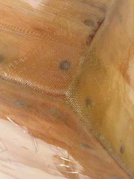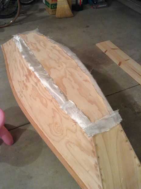 Como mencioné antes, la mezcla esta vez es sólo la resina y el endurecedor sin la harina. El procedimiento de mezcla es la misma. En primer lugar nos centraremos en las costuras exteriores donde las diferentes piezas de madera contrachapada unen entre sí. Antes de añadir el endurecedor, saque el paño de fibra de vidrio y cortar en tiras de 2" a lo largo. Lugar el corte de tiras en el barco a lo largo de las costuras para tener una idea de la posición y la cantidad de tela que se necesita. Una vez que termines con eso, agregue el endurecedor a la resina y mezclar bien. Recordar donde pones la tela de fibra de vidrio, tome el paño en el barco por ahora. Aplicar una capa de resina a lo largo de las costuras donde el paño solía ser. Luego la tela de fibra de vidrio vuelva a colocar el bote y presiona en la resina con un pincel. Ahora aplique otra capa de resina sobre la tela de fibra de vidrio. Seguir añadiendo resina hasta que la tela se convierte en el color de la resina. Esto es cuando sabes que has agregado suficiente. Hacer esto con todas las costuras exteriores, con eficacia ensamblar las piezas de madera contrachapada con el paño de fibra de vidrio.