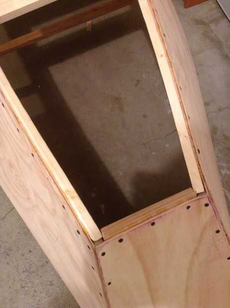 Ahora vas a cortar sus tablas de madera y usarlos como las espinas. Una vez más, debido a errores humanos, las medidas que usted necesita pueden ser diferentes de las que usé. Así que la mejor manera de hacerlo es simplemente colocar las placas en los lugares marcados adecuados y lápiz en las mediciones. Debido a la curvatura de la embarcación, los extremos de las tablas también se curva. Tengo que advertir que estas piezas de corte al tamaño correcto es muy desperdiciador de tiempo. Esto es cuando uso la más llana viene muy bien, como usted puede afeitarse pequeños pedazos de madera para crear la forma perfecta. Aplicar pegamento de madera y coloque estas espinas para el resto de la embarcación utilizando los 3" tornillos largos que compró. Tenga cuidado de tornillo en horizontal al utilizar los tornillos más largos, porque cualquier error hará que los tornillos empujar la parte superior o inferior de la columna vertebral. Utilice dos tornillos a cada lado de cada una de las espinas.
