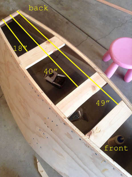 Una vez que haya terminado con la parte inferior "trim" (?) usted querrá añadir las espinas que los lados del barco aparte. Va a utilizar dos de los tableros de madera que compraste para esta operación. A partir de la parte posterior de la embarcación, medida 18" hacia el frente y hacer una marca en los ajustes que acaba de instalar. Haga dos marcas más en 40" y 49".