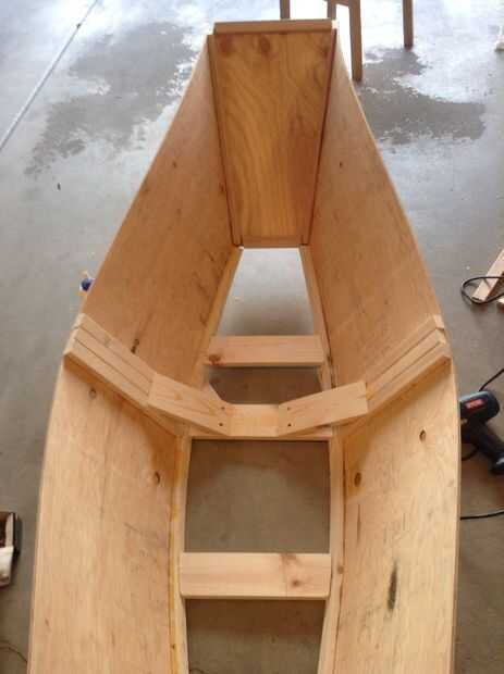 Todo va a pasar por encima de la columna media. Primero, tome uno de los seis 8' palillos que compraste y colocarla al ras contra el costado del barco, por encima de la media de la espina dorsal y descansando sobre el fondo del corte. Que desea marcar y cortar para que la parte superior de la vara quede al ras con la parte superior del puerto y de estribor lados. Repetir dos veces más para crear el tríptico. A continuación, tienes que triangular la esquina utilizando uno de los tablones de madera rectangulares que compraste. Corte a 8" y cortar los dos extremos de la tabla 8" en el sobre un ángulo de 30 grados. Una vez más, usted querrá afinar esto con la más llana debido a errores humanos. Cuando haya terminado, debe tener un pedazo de tabla que se ajuste bien contra la columna vertebral media y el tríptico que acaba de crear. Repita todo el proceso para el otro lado. Ahora puede retirar el palillo superior que sostienen los lados aparte.