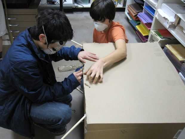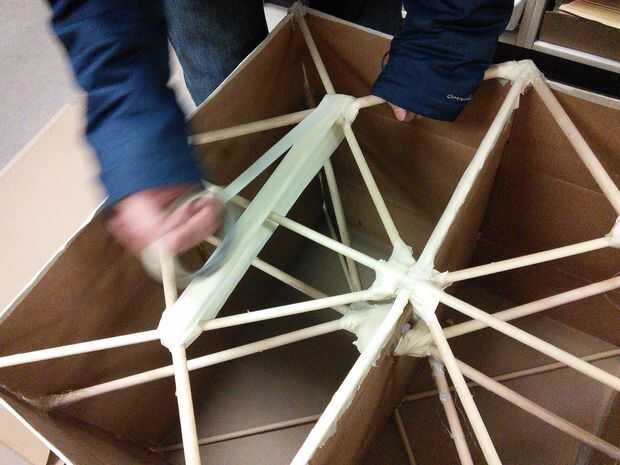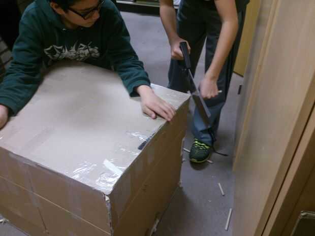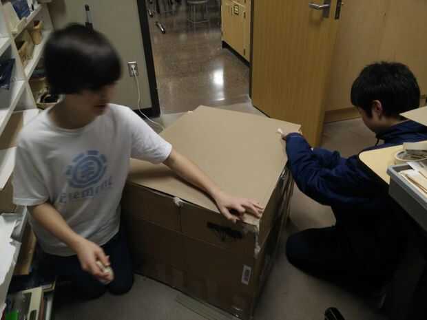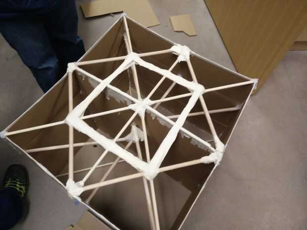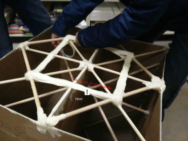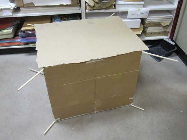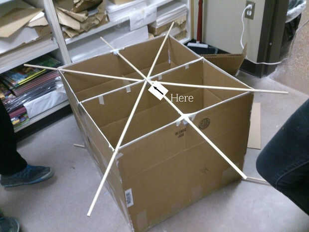 Luego, agregamos un adicional cuatro clavijas en la Cruz superior en una formación cuadrada para apoyar la parte superior (la puede ver en el cuadro cruzado medio). Usamos la cinta adhesiva para asegurar los pequeños tacos con los tacos grandes y las cajas. Para garantizar el apoyo un poco más, añadimos un cuadrado dentro de cuadrado con cinta de enmascarar. Luego, agregamos el cartón para terminar la parte superior.