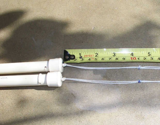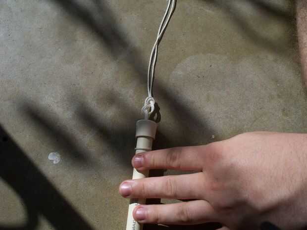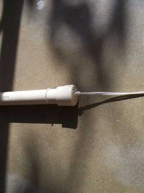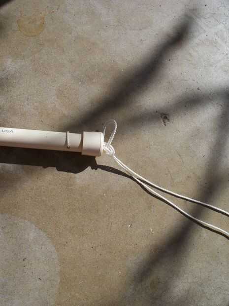 Ahora, utilizando las técnicas discutidas en el paso 6, pase las cuerdas de cada sección del extremo con otra tapa de extremo-con-un-agujero. Las grandes aberturas de las tapas de los extremos deben hacer frente lejos de los nudos como se muestra a continuación.