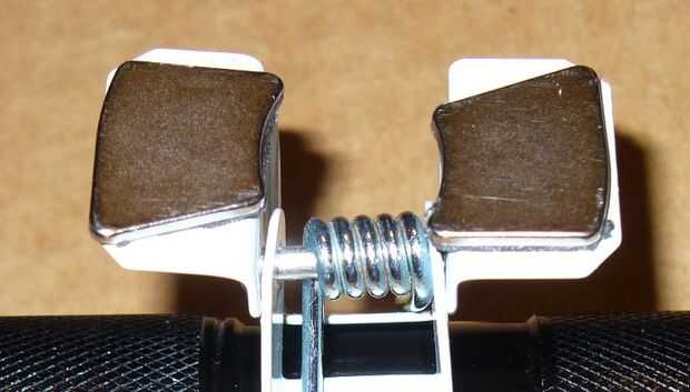 Alrededor de la cinta, retire la cubierta protectora en el otro lado de la cinta y presione cada imán en las orejas de la abrazadera, sugiero hacer un imán a la vez. Si utilizas epoxi, te sugiero unos guantes desechables, como puedo ver que esto podría conseguir desordenado si los imanes no sujetan el clip mientras se cura. Imanes de vuelo salpicaduras epoxy puede ser un proyecto frustrante.