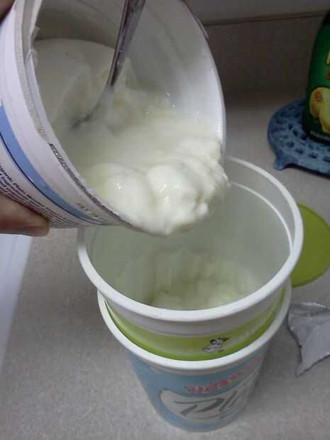 Cuchara/pour o de lo contrario todo el yogur comprado volcado en el recipiente superior.