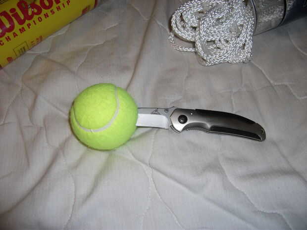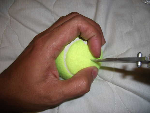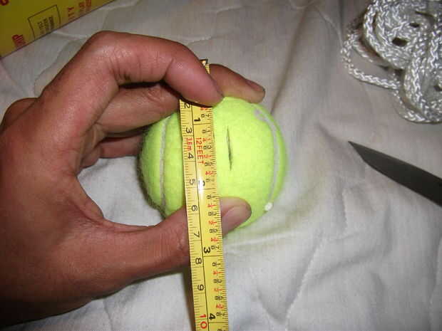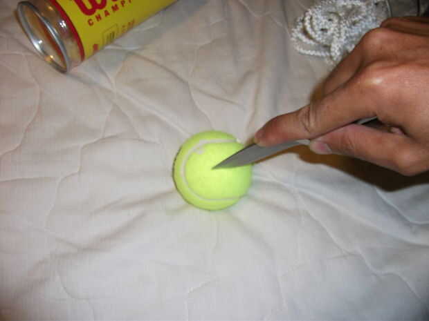 Permítanme decir primero que creo que una hoja más pequeña sería mejor en lugar de una hoja grande (como decir un cuchillo de cocina) porque desea minimizar el agujero en la bola. Sostenga la bola firmemente contra algo (no la palma de su mano) y cuidadosamente empuje la bola con su cuchillo. Quieres tener el cuchillo de cortar una ranura de 3/4" largo en un lado de la bola.