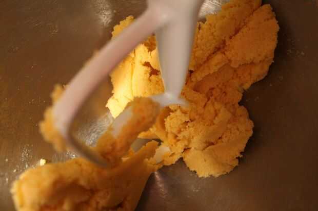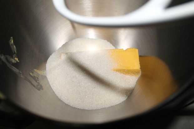 Mezclar el azúcar y la mantequilla hasta que no pueden distinguir las fases (segunda foto).