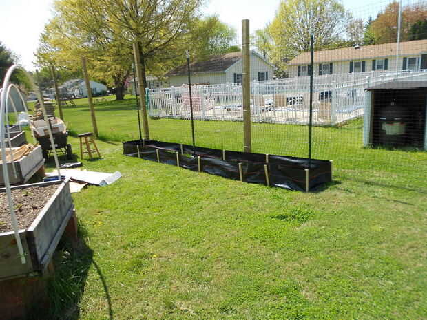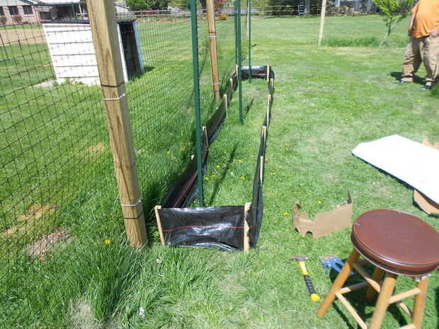 De una estaca de la esquina, comience a desenrollar el légamo esgrima, grapado en el interior de la estaca, con 5 o 6 grapas de la parte superior de la estaca a la parte inferior. Línea del borde superior de la esgrima de limo para arriba con la parte superior de la estaca. Recuerde que se entierra la estaca 24" 12' en la tierra, con 12" sobre la tierra, y el légamo vallado es 18" de alto. Debe tener 6 pulgadas de limo vallado superpuestas o "sobras" en la parte inferior, plegado sobre en el interior de la zona de la caja. El material en el interior de la grapa hacia el área de cada estaca después de colocar el material en cada juego. Yo uso el martillo pequeño para terminar las grapas que no pueden penetrar en las estacas de madera dura.