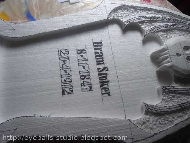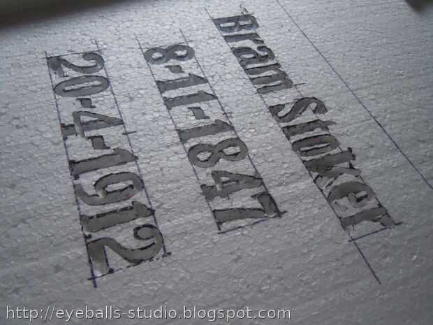 Dibujaba los nombres, junto con sus fechas de nacimiento y muerte, en las piedras con un marcador y luego había grabado utilizando una herramienta de leña. Esto fue un poco difícil, porque esta herramienta es increíblemente caliente y puede fácilmente arruinar tu trabajo! Esto resolví apagando y encendiendo cada minuto o así para mantener la temperatura en la gama. También utilicé este método para crear el efecto en las alas de murciélago en piedra de Bram Stoker.