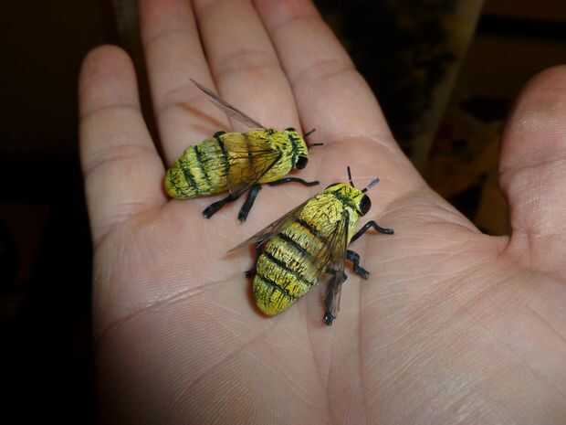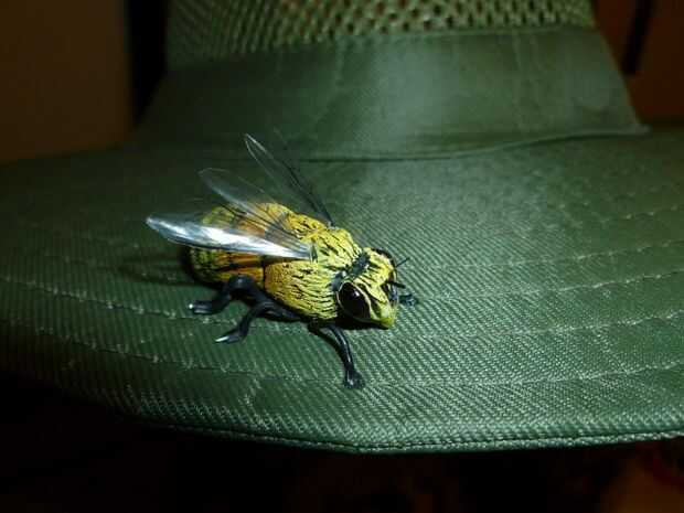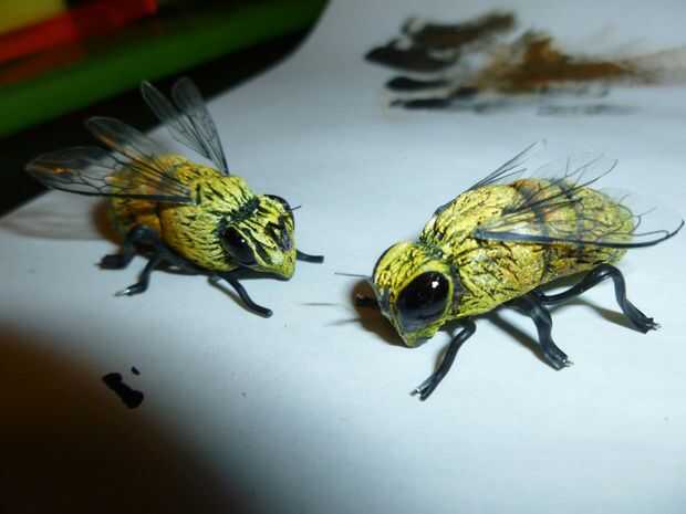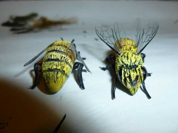 hice un par de "héroe" de abejas que acentos en mi sombrero de estilo del apicultor.  Éstos fueron hechos de sculpey arcilla polimérica con twist tie las piernas. fueron pintados de manera similar a la barba. Usé más pegamento para pegarlas al sombrero.