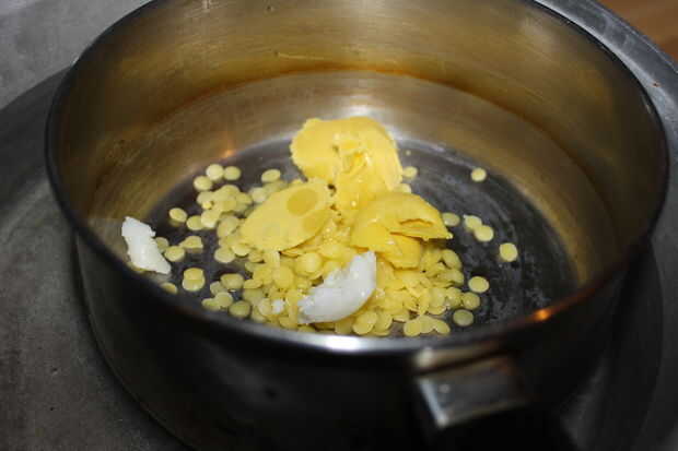 1. colocar todos los ingredientes, excepto los aceites esenciales, en un baño María y calor bajo hasta que los aceites están fundidos juntos. Revuelva a menudo.