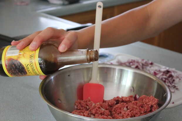 Añadir unas gotas de salsa Worcester a la carne molida.