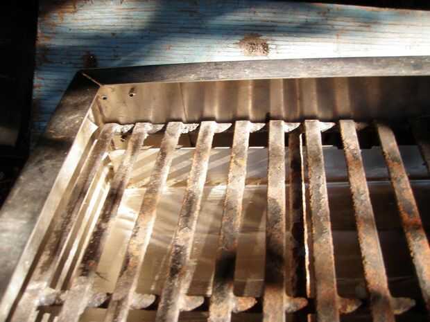 Corté la parrilla de carbón a la medida, poner la sábana bajera y el carbón la parrilla en fijar la lengua en el primer lado de la base, perforado y remachados juntos. En este caso los remaches fueron en desde el exterior para que el extremo largo está dentro y no interfiere con la parte superior hacia abajo.