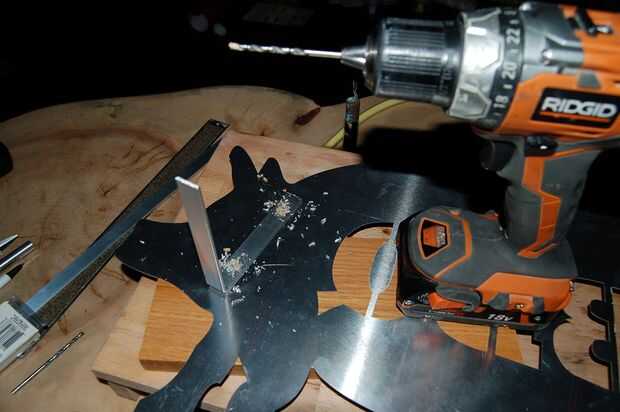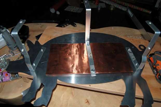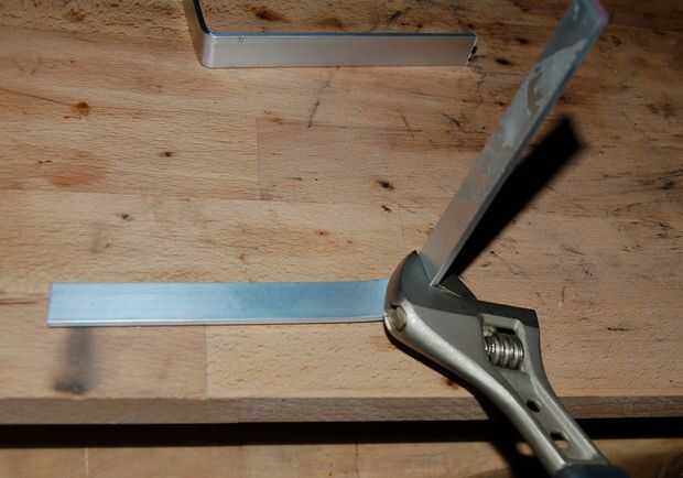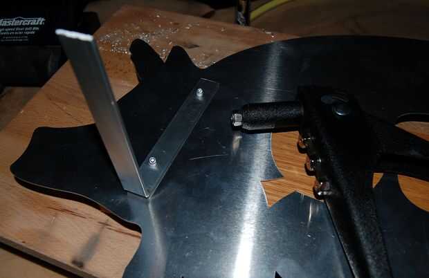 Usar una pistola de remache manual, había clavado los soportes al cerdo asegurándose de que era el lado "limpio" del remache en la parte exterior de la muestra. Si nunca has usado una pistola de remache antes de que lo recomiendo para este tipo de trabajo ya que es rápido, fácil y da un acabado agradable, limpio que todavía tiene un toque industrial.