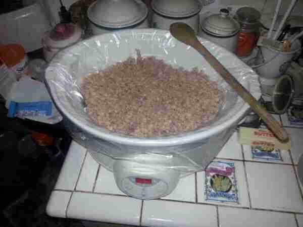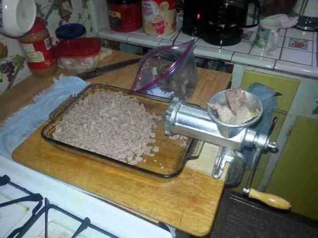 tamaño conveniente para su molino. Pasar la carne por un molinillo de grueso. Volver a la olla.