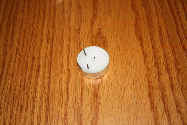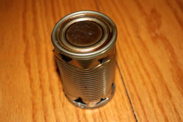 para hacer la vela asoman dos agujeros en la cera de la vela principal con un palillo de dientes a continuación, retire la cera de la vela de cumpleaños. t corte la mecha de la vela de cumpleaños en dos trozos de 1cm de largo y pegarlas en los agujeros. luz todos tres mechas puestos la lata sobre la vela, si la llama va 's hacia fuera poke luego más agujeros en la lata. entonces listo. entonces usted cocinar los alimentos en la parte superior de la lata. Espero que os guste.