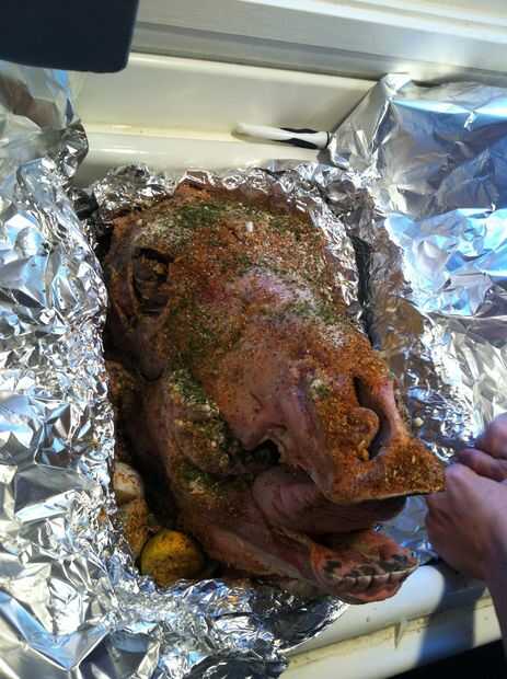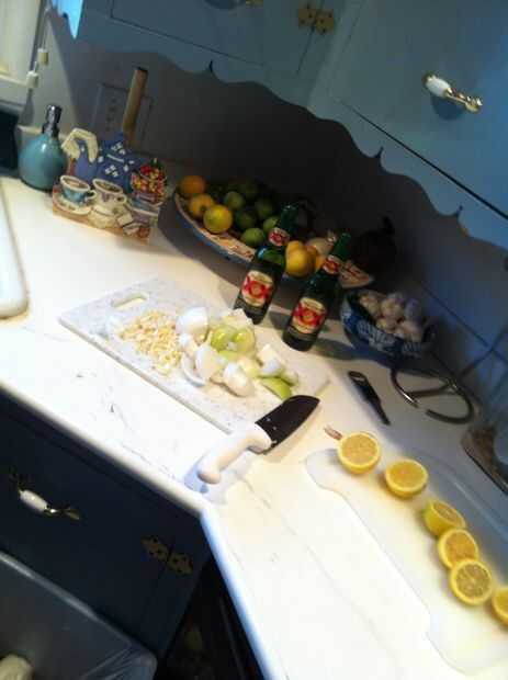 Picar cebollas, ajos y limones de la rebanada para relleno y fuera de la frotación. También añade perejil, pimienta, sal.