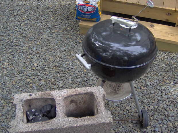 Mantener la baja temperatura mediante el ajuste de la ventilación. Cuando la temperatura comienza a disminuir y la ventilación de la parte inferior es abierta deberás empezar más carbón para agregar a la olla. Esto sucederá aproximadamente una hora y media en la cocina. Puede utilizar mi método de "Tabique" que en este caso monté encima mi ahumador de agua debido a que no estaba usando, o un encendedor para chimenea. Inicie la comprobación de la temperatura del pollo después de 3 horas. Pollo en salmuera dispara para 160 grados antes de que dirijo parrilla (se explica en el paso siguiente). Si eligió no en salmuera, objetivo para 150 grados antes de asar directo