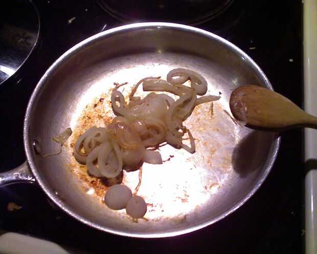 Como esperando el fuego hasta conseguir temperatura saltear algunas cebollas en una sartén para montar en su hamburguesa.
