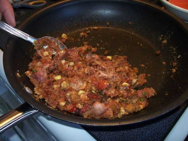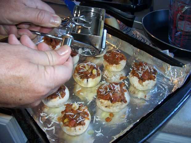 9. una vez que el relleno está bien cocido, rellenar las tapas de champiñones y cubrir con queso rallado Si se desea.