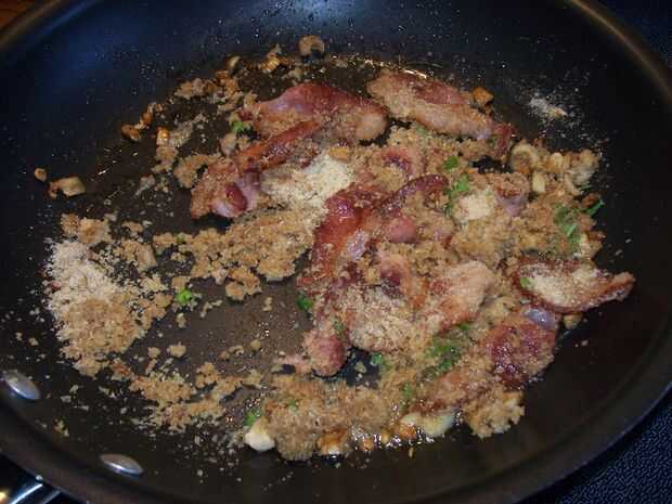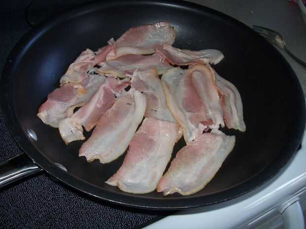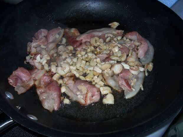 2. empiece a cocinar unas tiras de tocino picado (yo usé 6 tiras de 12 setas), en una cacerola en la estufa.