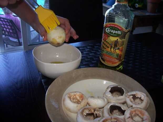 8. mientras se cocina el relleno, untar las tapas de setas con aceite de oliva y en una bandeja que se adapta a la barbacoa.