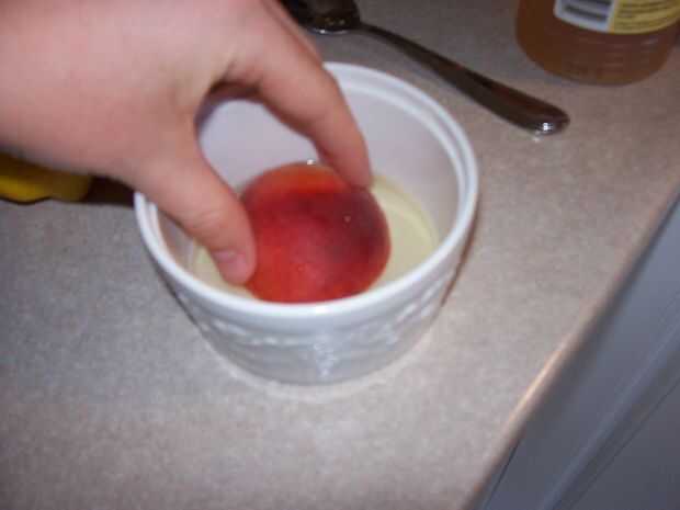 4. Sumerja las caras planas de los melocotones en la mezcla de limón/miel. Y apartar.