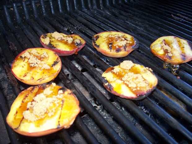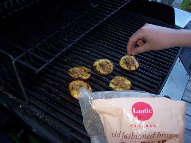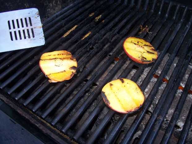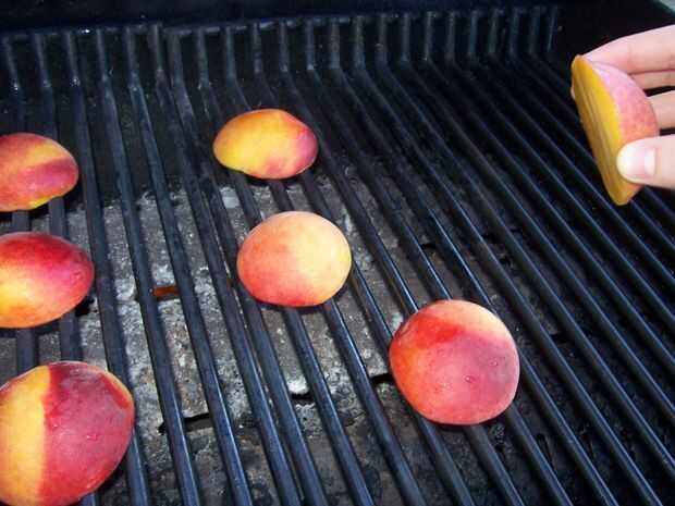 5. poner los melocotones a la parrilla y ellos cara plana hacia abajo en la parrilla. (puede que necesite limpiar la parrilla primero si hay cualquier grasa de salmón).