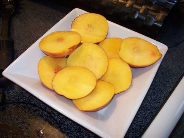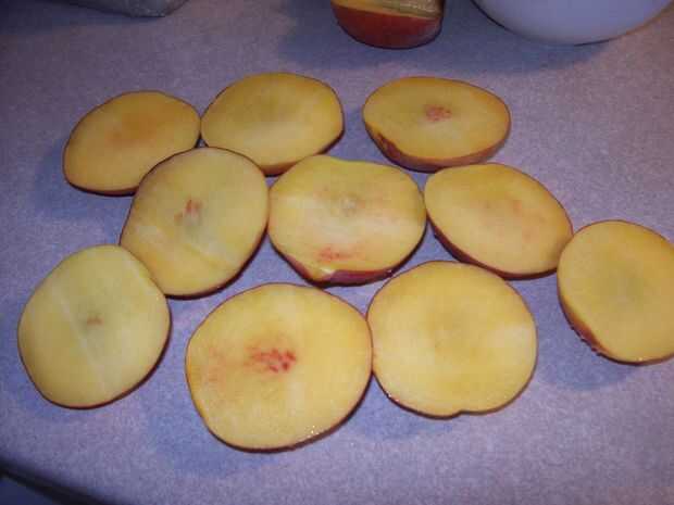 7. una vez que se girarán, espolvorear azúcar marrón sobre los extremos planos que ahora están mirando hacia arriba. (En esta época del año algunas veces los melocotones necesitan un poco de endulzamiento para arriba).