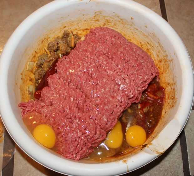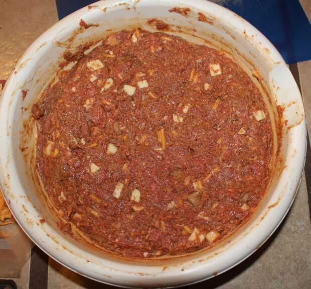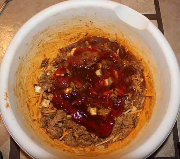 Poner todos los ingredientes en un gran tazón de fuente y llegar con ambas manos. Mix, puré, moosh y smoosh hasta que todo está bien mezclado.