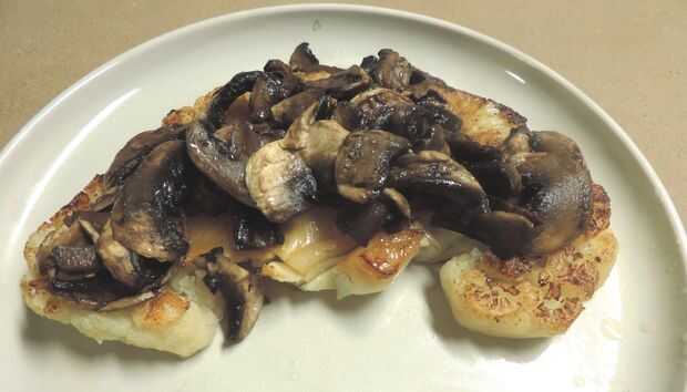 Retirar los champiñones y dejar de lado. Añadir más mantequilla y marrón en la sartén y cuando esté bien dorado, con una aleta de huevo, la rebanada en una sartén caliente con mantequilla dorada. Cook la rebanada hasta que se dore y un poco crujiente, no se queme. Gire la rebanada y brown en el otro lado. Cuando ambos lados estén dorados, retirar el segmento en el plato para servir. Caliente las setas que se reservan. Lo hice en el microondas. Sofoque la rebanada en setas y añadir salsa al gusto. Agregar otras verduras que se les sirve. Tendrás un plato lleno de verduras pero más como las otras placas se sirve.