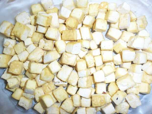 Abierto y desagüe el tofu. Puede resecar el tofu por borrar en una servilleta para conseguir toda el agua que usted puede hacia fuera. Cubo el tofu y colocar en una bandeja de horno seguro. Ahora, gire en la posición de asar en el horno a alta (tengo un horno eléctrico que ahora que hace la diferencia si tiene gas). Cocinar el tofu hasta que es seco y ligeramente tostado, unos 20 minutos. Asegúrese de que mantener girándolo para que esté uniformemente dorada.