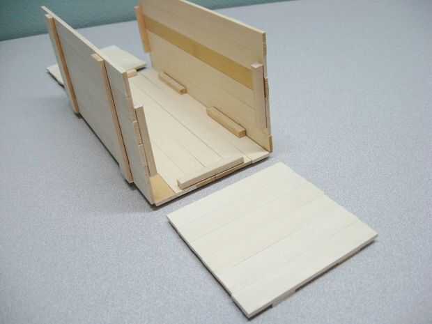 Trocear un trozo grueso de 3/4" pieza de pino en 1/8" tiras con mi sierra de mesa. De estas tiras corté 24 piezas que eran 10 1/2" de largo y 24 piezas que fueron 4 1/2" de largo. Éstos fueron montados como se muestra con pegamento caliente para hacer la caja de transporte.