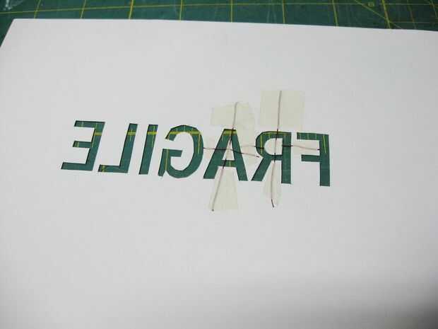 Una plantilla se hizo para grafitear en las palabras "Frágil" y "THIS END UP". Consulte las notas de la foto de un tip de como hacer las secciones "flotantes" de las letras.