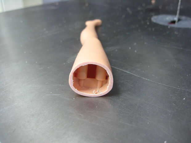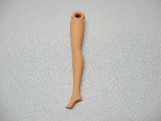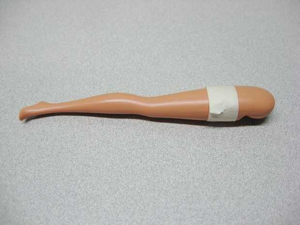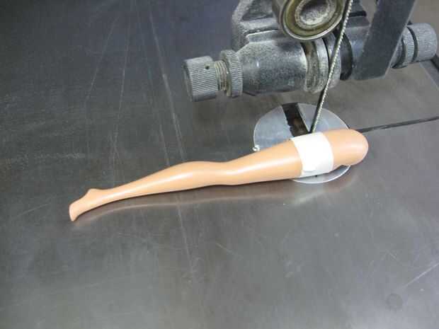 Utilicé cinta adhesiva para crear una línea de corte limpio agradable en la parte más alta de la pierna, justo antes de empezar el área. Usted podría utilizar una serie de herramientas para hacer este corte, pero si tienes acceso a una sierra de banda será rápido e indoloro para usted y para Barbie.