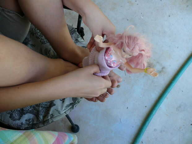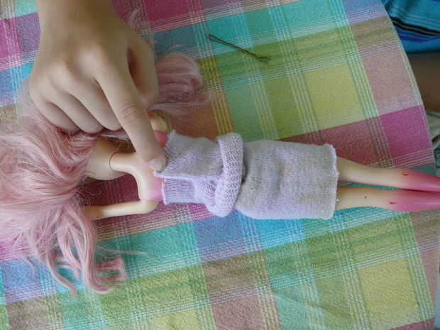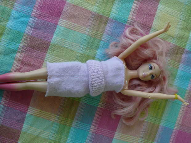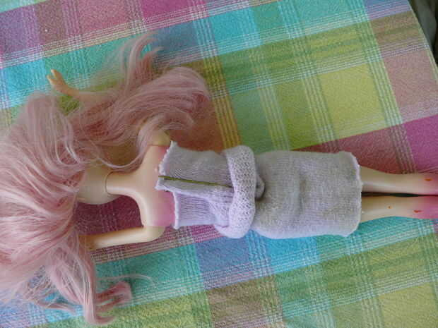 Manos de poner Barbie arriba y puesto en camisa, tira hacia abajo la parte superior del calcetín.  Asegúrese de que el borde acabado va abajo a la cintura.  Ruede para arriba el borde inferior para hacer una banda de acento agradable y constituyen la línea del borde superior con su línea del busto.   Le vuelta y doblar el material sobrante y asegure con horquilla.  Podría coser esto si usted quería que fuese terminado pero mis chicas sólo dejan ropa Barbie.01238569948 segundos, en promedio, por lo que había sentido.  :)