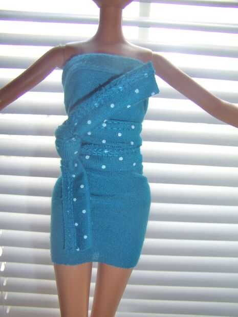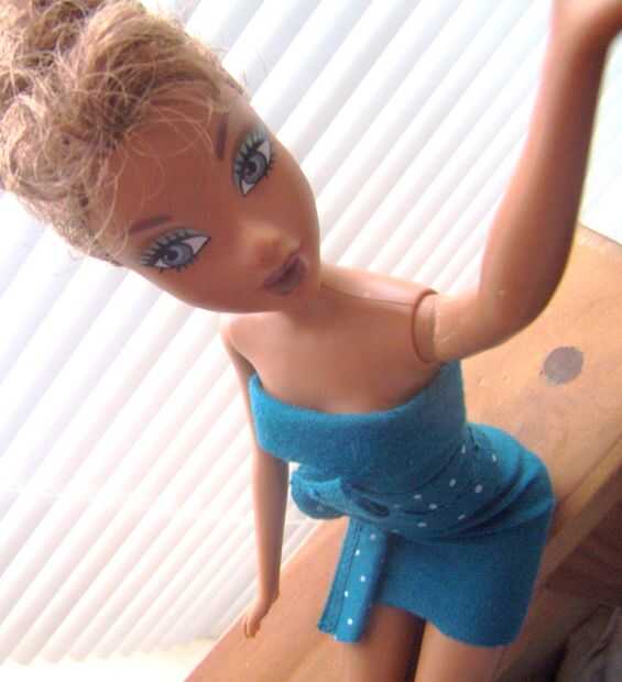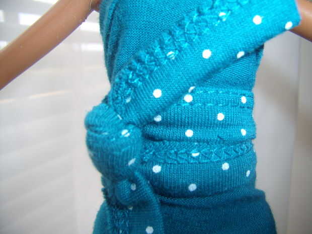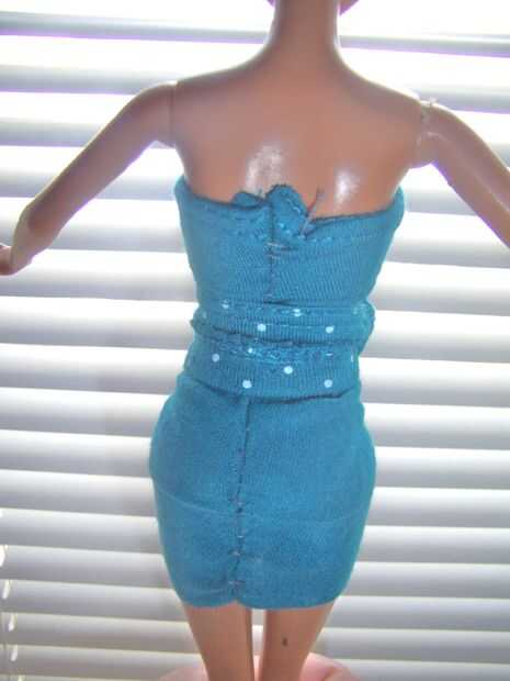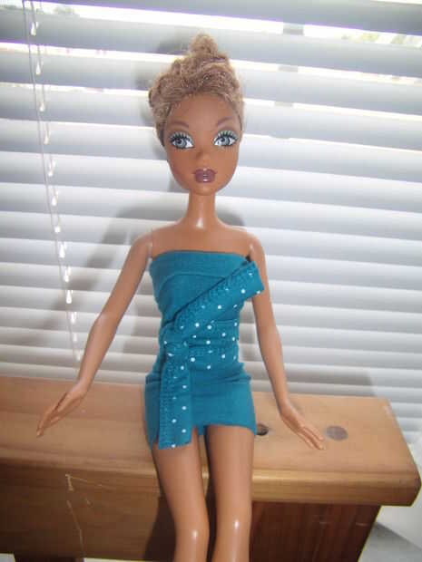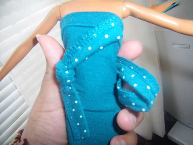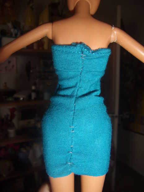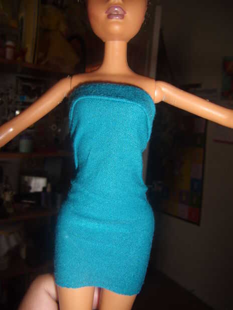 Todo lo que tenía que hacer era hacer un tubo básico vestido fuera de un cuadrado de 6 x 6 pulgadas de jersey azul matterial. [La mano cosida]