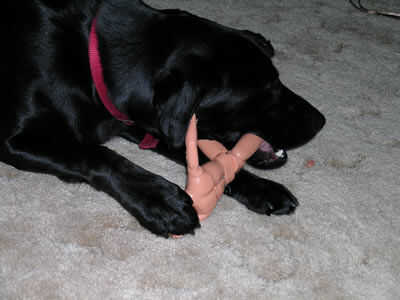 Mientras pasar horas super pegado de figuras de acción juntos para mi primera corona de juguete, comenzó planes para hacer una guirnalda de Barbie. Un obstáculo para hacer una guirnalda de Barbie es la dificultad en la obtención de Barbies baratas. Bueno, afortunadamente para mí, un amigo fue al acecho a cuando vieron a granel Barbies en sólo $1 cada uno. Seleccionar una docena y comprado para mí y llamado para avisarme sobre el hallazgo. Bueno, fui y compré el resto de ellos. El problema es que hay un Ken en el montón. No quería que mi guirnalda que cualquier hombre-muñecas en él por lo que se convirtió en un juguete de perro.
