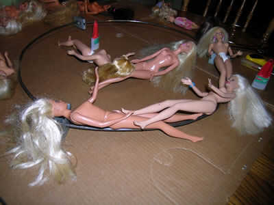 La siguiente cosa a hacer era empezar a colocar las muñecas en el aro. Escribir algún cartón para que accidentalmente no pegue las muñecas a la mesa de comedor roble. El pegamento estupendo un poco va un largo camino. Mi novia era bastante amable con cepillo el pelo de las Barbies que los hizo tan bueno mirar que casi he cambiado mi mente trata de poner pegamento en las grietas de su tope. Pero el proyecto llevado a cabo a pesar de cualquier resurgimiento de adolescentes aplasta.
