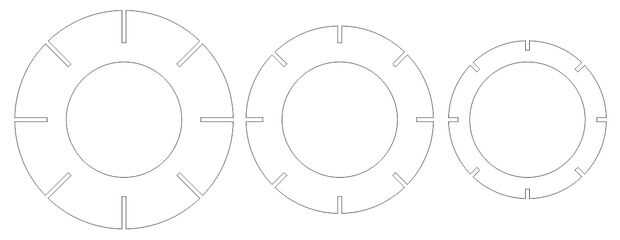 Añadir ocho cortes distribuidos igualmente a cada uno de los anillos a lo largo de la circunferencia exterior. Estos deben coincidir con el ancho de la cartulina que está utilizando. La profundidad debe ser igual a la anchura del anillo menos la altura de la abertura correspondiente en la pieza de perfil.