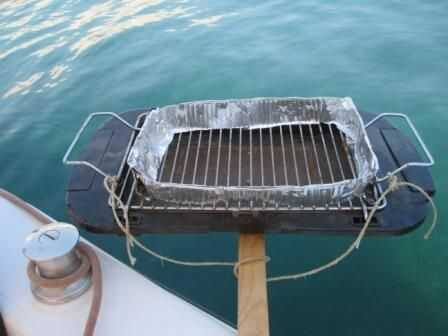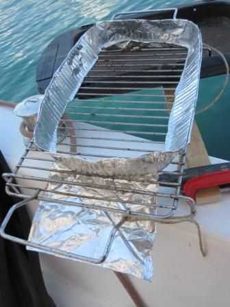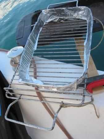 En el caso de las ondas debe proteger su alimento caiga en el agua. Se puede utilizar papel de aluminio o placa de aluminio como en este caso. Simplemente cortar y utilizar su parte inferior para fijar a la rejilla. Coloque los alimentos dentro de esta frontera y no te preocupes. También hay cuerda de fijación adicional para mantener la red segura.