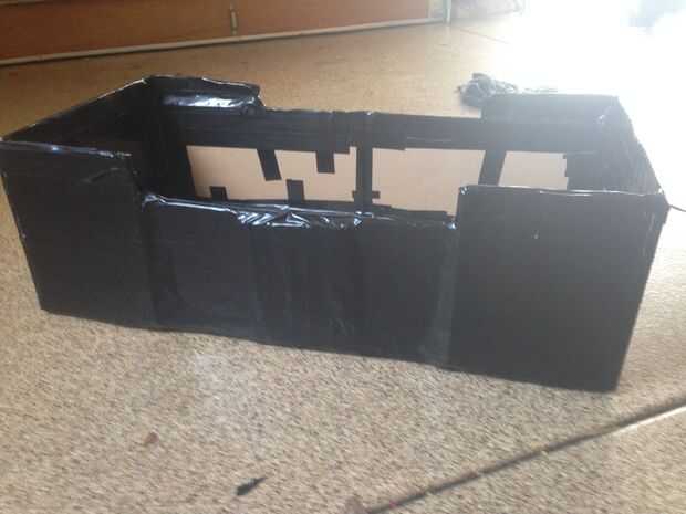 Mi amigo y yo hecho un barco de cartón y cinta adhesiva para el hijo de mi primo para su cumpleaños. Nos aerosol pintado el barco marrón y anclaje de la plata, de lo contrario, todo es cartón o conducto de cinta (excepto el poste de bandera, que es d