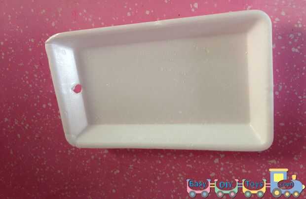 Encontrar una bandeja de comida super mercado, hacer un agujero como este pic.