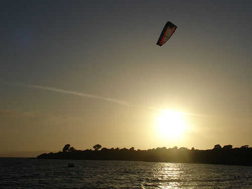 Un hombre de la cometa, sobre los timones y un mono de lastre.