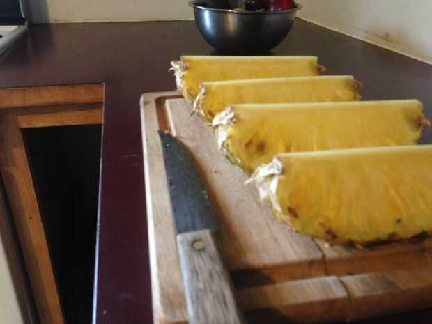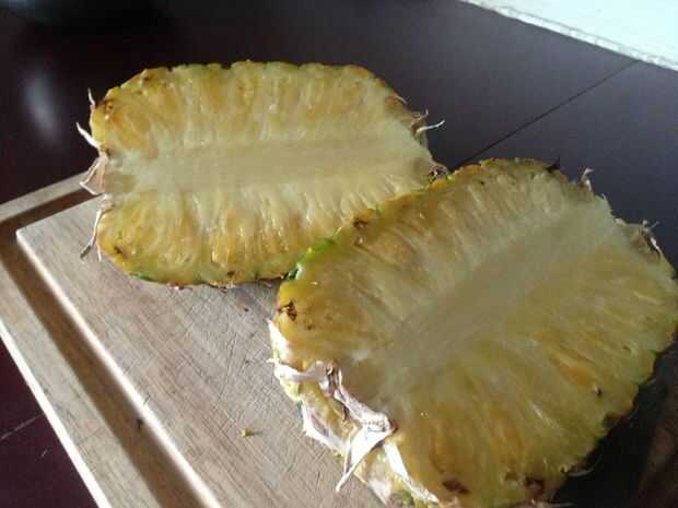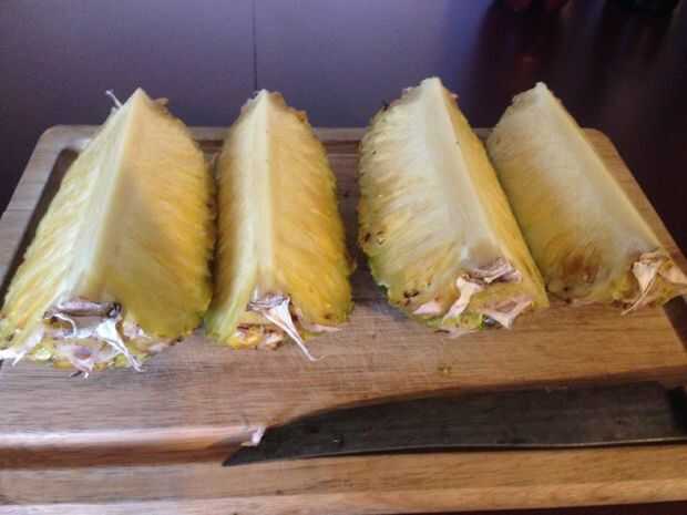Para esto se necesita al menos una piña, una tabla de cortar y un cuchillo. Yo prefiero con un cuchillo largo y afilado que no es demasiado amplio (no como ancho como cuchillo de un cocinero, pero más grande que un cuchillo del filete). A veces se llaman un cuchillo de cocina o un cuchillo. Lo más importante, utilice un cuchillo con que usted es cómodo. Primero se corta la piña por la mitad longitudinalmente. Luego corte cada mitad por la mitad, también longitudinalmente. Ahora tu piña debe cortarse en cuatro pedazos.