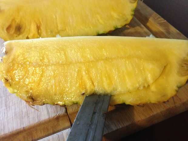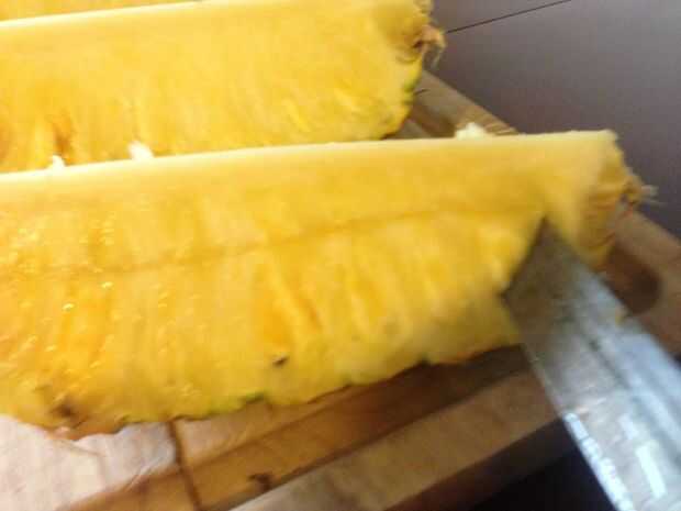 Este paso se realiza dos veces, una vez en cada lado de la piña. A partir de la parte superior de la piña donde comienza el corte de la base, cortar la piña fuera de la piel. Debe ser como cerca de la piel como usted puede sin meter a través de la piel. Esto maximizará la parte comestible de la piña. La parada más y a partir de que haces el Funky su barco se mira, así que trate de cortar en un solo movimiento fluido. Ahora repita en el otro lado. Cuando haya terminado la parte comestible de la piña debe ser totalmente separados de la base y la piel, pero todavía de estar en su lugar. Intente meter y ondulación en la piña a ver si esto es verdad. Si su todavía había atado en alguna parte, saber dónde y corte suelto.